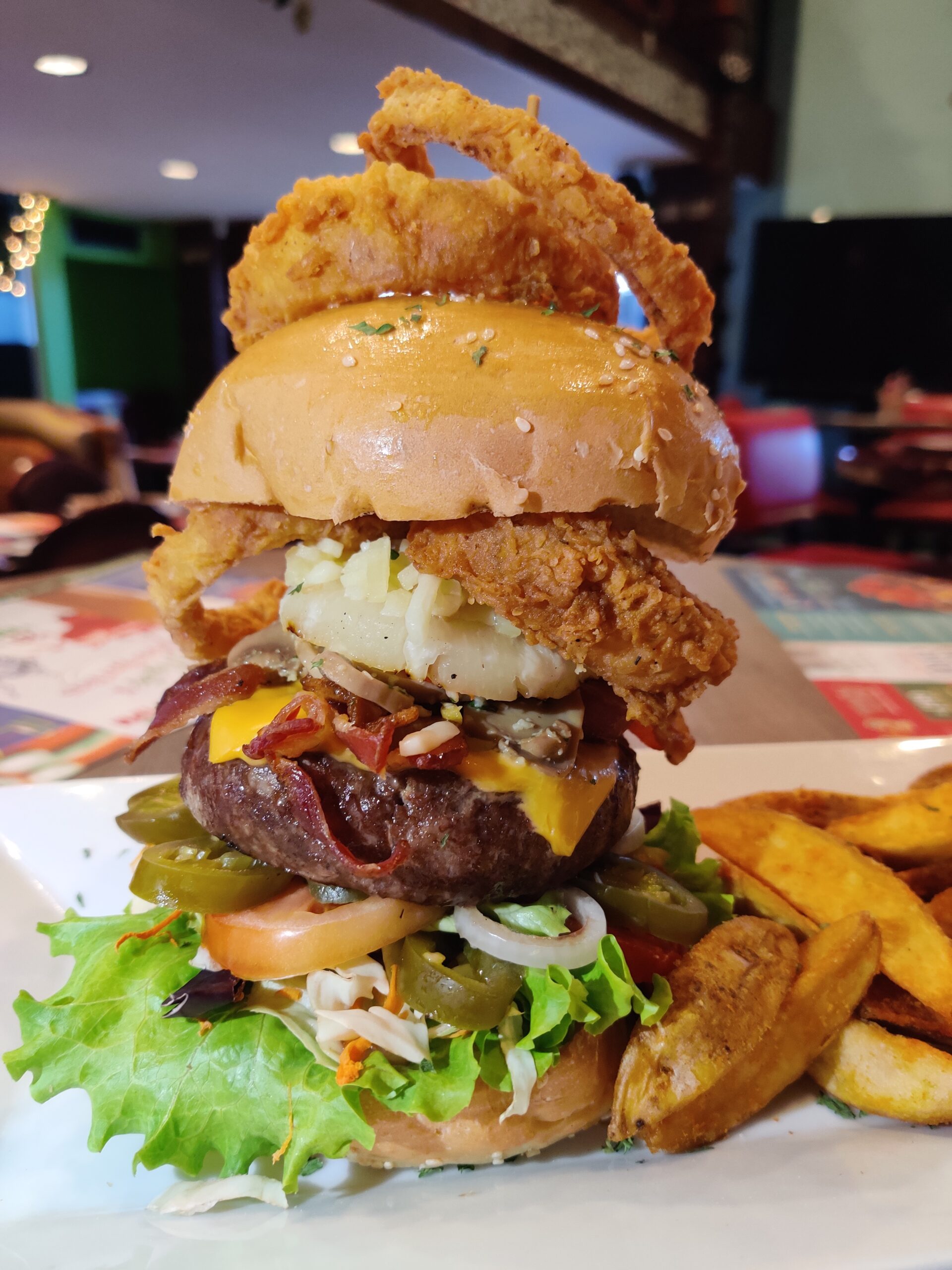 Our all beef pattie topped with bacon, mushrooms, American cheese, mozzarella cheese, pineapple, jalapeños, onions & tomatoes on a toasted bun, topped with onion rings! – Served with potato wedges
